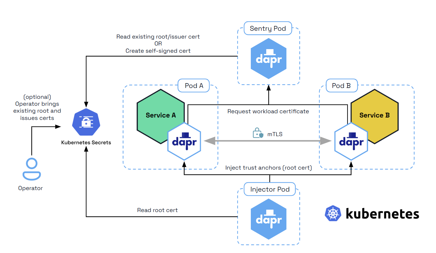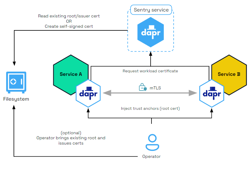 The Dapr Sentry service manages mTLS between services and acts as a certificate authority. It generates mTLS certificates and distributes them to any running sidecars. This allows sidecars to communicate with encrypted, mTLS traffic. For more information read the sidecar-to-sidecar communication overview.