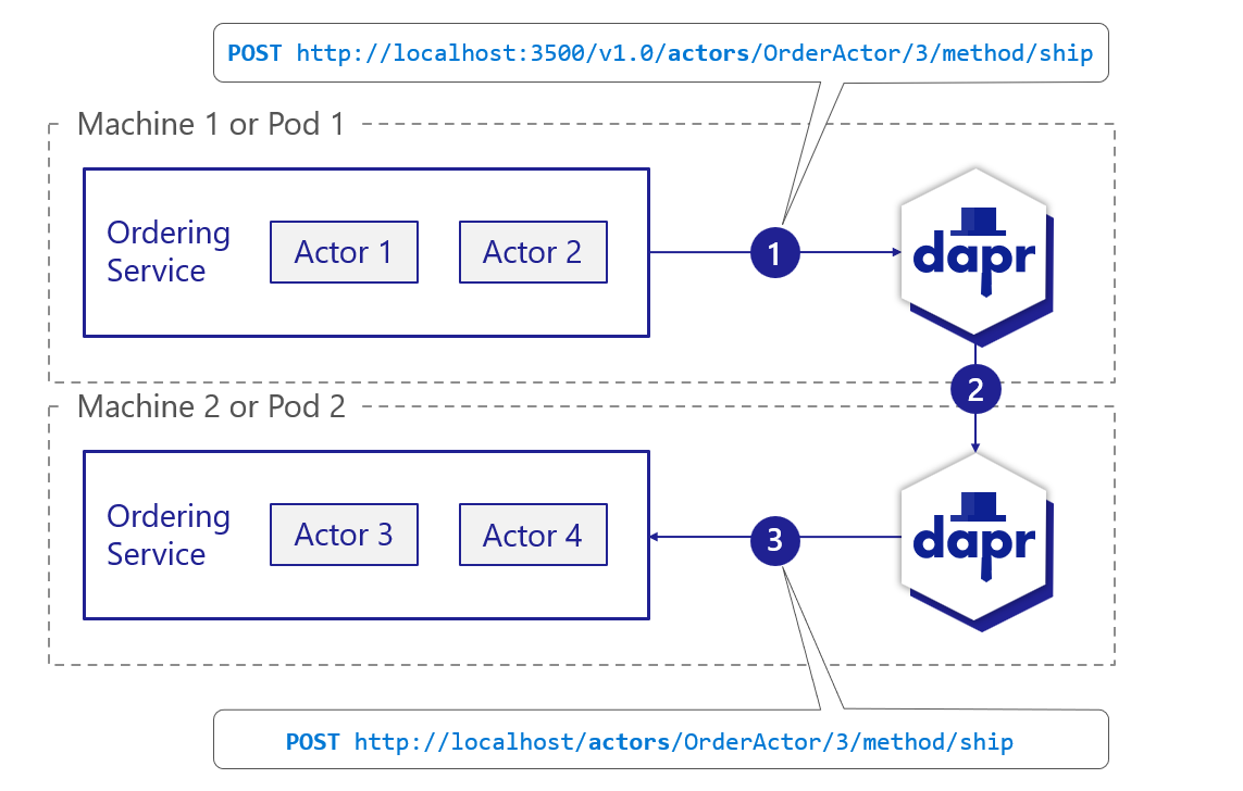- The sidecar instance in pod 2 calls the service instance to invoke the actor and execute the actor method.