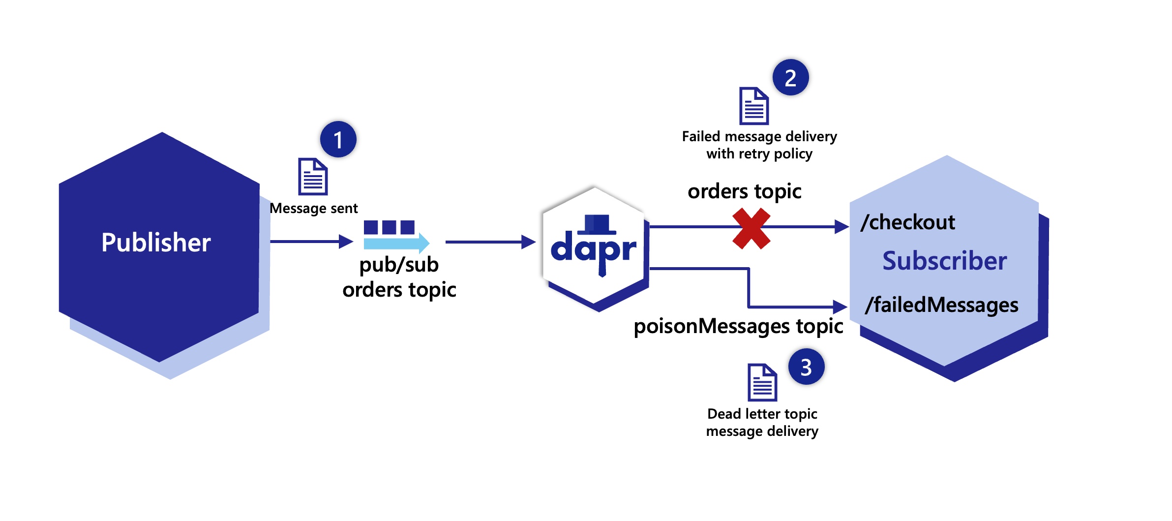 Dapr enables dead letter topics for all of it’s pub/sub components, even if the underlying system does not support this feature natively. For example the AWS SNS Component has a dead letter queue and RabbitMQ has the dead letter topics. You will need to ensure that you configure components like this appropriately.