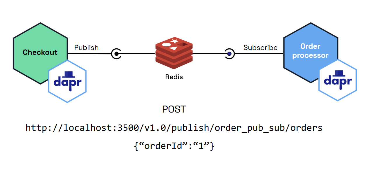 In the checkout publisher service, we’re publishing the orderId message to the Redis instance called orderpubsub (as defined in the pubsub.yaml component) and topic orders. As soon as the service starts, it publishes in a loop: